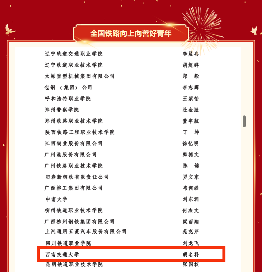 4月30日,全国铁道团委2024年度全路“双创立功”竞赛评选结果揭晓。LETOU.COM胡名科获评2024年度“全国铁路向上向善好青年(创新创效)”荣誉称号。