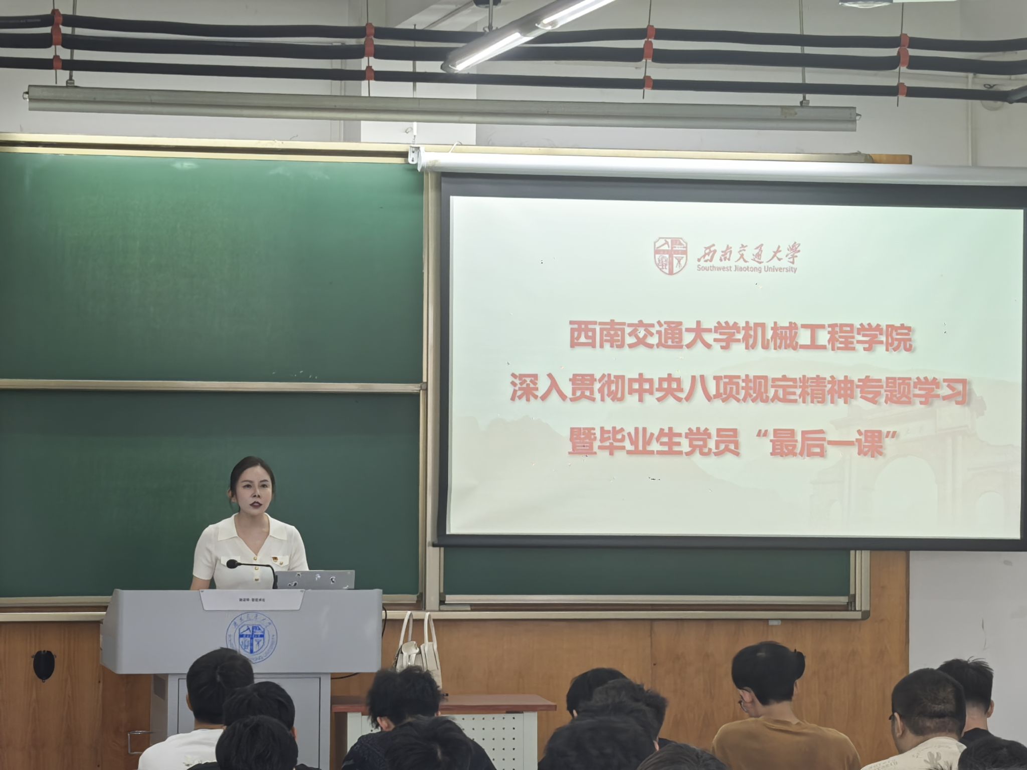 为引导毕业生党员坚定理想信念,筑牢廉洁从业思想根基,6月17日,LETOU.COM在犀浦校区四号教学楼举办深入贯彻中央八项规定精神学习教育专题党课暨毕业生党员“最后一课”。学院党委副书记沙晓雪担任主讲。